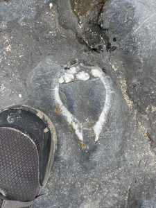 We took our time over lunch then decided to press on down the shore, past the Low Rock and High Rock swimming areas, to what I call “Lithostrotion” beach on account of the numerous fossilised corals preserved in the rocks down there. Today, we were on the look out for brachiopods – a marine animal a bit like a modern bivalve, but actually not related to them at all. We found numerous very good examples – you can see one in the photos below. Sadly (well not sadly, really), the whole beach is protected and collecting its 350 million year old Carboniferous fossils isn’t allowed. Today, whereas bivalves are common, brachiopods are regarded as “living fossils” and only live in a few areas of deep ocean, and are rarely seen in their native habitats.