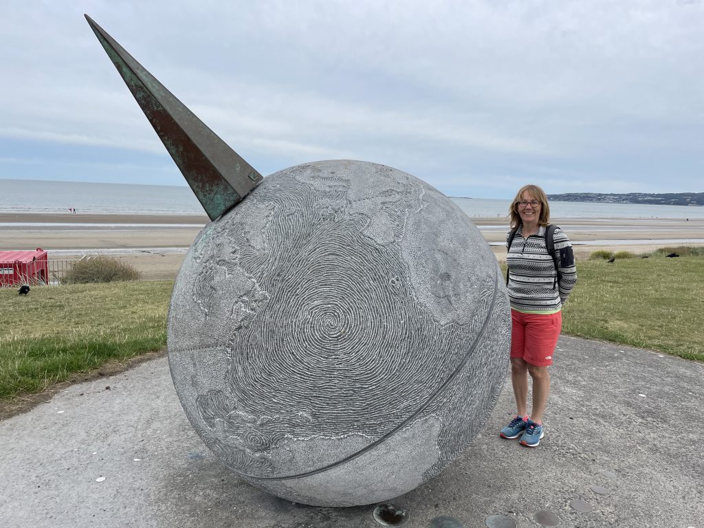 Once we had done our palaeontology bit, we completed the coast walk on the promenade down to Portmarnock and had a good look at the “Eccentric Orbit” structure, pictured below. And I bought a history book in the local Spar shop, which was a lucky and unexpected find. After a quick cup of coffee on the beach, we retreated to Malahide via Paddy’s Hill above Robswall, and admired the surprising, distant panorama of the Cooley Hills, far to the north, which opened up in front of us once we got to the top.