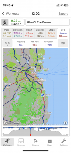 Close-up location (The blue line shows where we walked) (Click button below to download GPX of today’s walk as recorded, or see interactive map at bottom with elevations corrected): Glen of The Downs DWC recce |