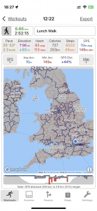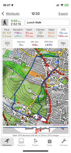 Close-up location (The blue line shows where we walked) (Click button below to download GPX of today’s walk as recorded, or see interactive map at bottom with elevations corrected): UK Lunchtime walk |