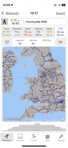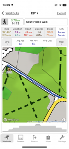 Close-up location (The blue line shows where we walked) (Click button below to download GPX of today’s walk as recorded, or see interactive map at bottom with elevations corrected): Longer countryside walk |