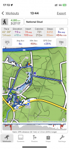 Close-up location (The blue line shows where we walked) (Click button below to download GPX of today’s walk as recorded, or see interactive map at bottom with elevations corrected): National Stud Kildare |