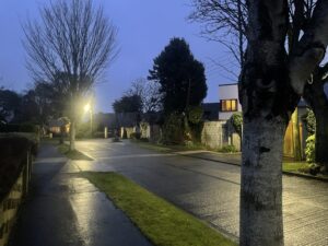Tonight I decided to use my freedom to walk out to the west of Malahide, through the “newly discovered” (to me) Árd Na Mara estate, and on to Centra at the end of the Yellow Walls Road. As soon as I got into the estate, I noticed something strange. It was quiet. No trains, no planes, and even the traffic on the Dublin Road was just a distant buzz. All this silence meant that I could hear birds singing – quite a cacophony actually, and a real “evening chorus”. The winter’s counterpoint to the dawn chorus of early summer perhaps. Anyway, whatever it was, it was delightful to hear.