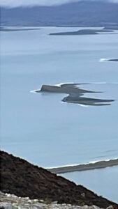 We weren’t content with just one walk today, so immediately we had got back in the car, we drove about 1km down to the coast at Berta Beach. This is a curious periglacial feature, the remains of an eroding partially submerged drumlin. The thin tombolo connecting the drumlin to the mainland is slowly being consumed by a rising sea – Darragh did quite quite a lot of damage a few weeks ago – and it probably won’t be long before it disappears completely.