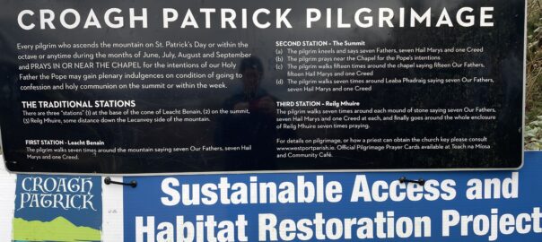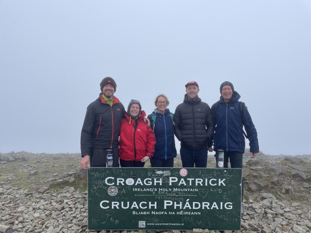 Today’s summary | After a full Irish breakfast we drove a couple of km down the road to the start of the Croagh Patrick path. We set off on the climb at about 11:15 and completed it (and back) in about 3½ hr, a good 30 mins quicker than last year. Quite a few people about today. Misty on the top but no rain and very little wind. Walked out to Bertra beach afterwards. Ham in cola for dinner. | ||||