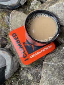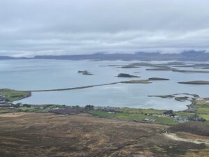 There were quite a few people about today – certainly a lot more than we did this same walk on Christmas Day last year. The weather was better this year, too, with much less wind and milder temperatures. We were up – and back down again – in next to no time, it seemed. There were no views from the top, so we didn’t linger, but paused halfway back down for coffee and an energy bar overlooking the magnificent islands of Clew Bay.