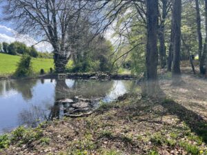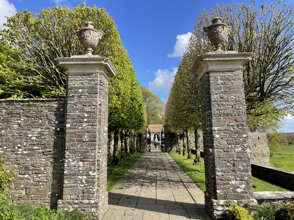 Once parked up, we set off to walk down the valley to the gardens. On the way, we took a detour to look at the “Claude’s Seat” folly, overlooking the dammed lake just before the village of Ballinakill. We were also struck by a vigorous (and actually quite painful) hailstorm midway, making us glad we had our waterproofs but slightly wishing we had also brought an umbrella.