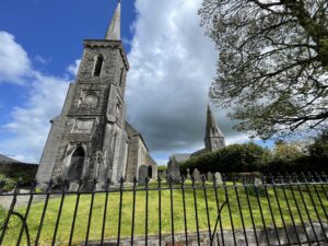 As soon as we got to the village, the sun came out and we briefly enjoyed vivid blue skies again. Ballinakill itself was interesting – especially because it had two churches right next to each other. There must be some history to that, but I don’t know what it is. Like everywhere, it was very quiet today.