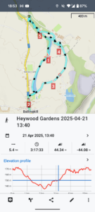 Close-up location (The blue line shows where we walked) (Click button below to download GPX of today’s walk as recorded, or see interactive map at bottom with elevations corrected): Heywood Gardens |