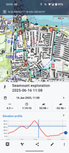 Close-up location (The blue line shows where I walked) (Click button below to download GPX of today’s walk as recorded, or see interactive map at bottom with elevations corrected): Seamount exploration |