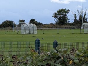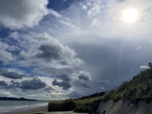 At Portmarnock we just had to go into the Spar shop where we treated ourselves to rather nice flat whites and pastries, which we enjoyed on the beach. Though I say “enjoyed” in a slightly qualified tone, because it was very cold in the wind, and storm clouds were amassing, so we didn’t hang around too long. I actually began to question the wisdom of wearing shorts today. But as the official short wearing season doesn’t end until mid-October at the very earliest, the possibility of swapping for long trousers could not possibly be entertained.