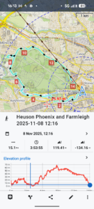 Close-up location (The blue line shows where we walked) (Click button below to download GPX of today’s walk as recorded, or see interactive map at bottom with elevations corrected): Sunny Heuston Farmleigh Phoenix loop |