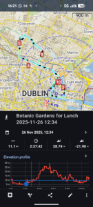 Today’s summary Had a video call with Val in Vancouver first thing and worked on my PC backup a bit more.   Then took a train into Dublin and walked from Connolly to the Botanics via the canal.   Had an excellent roast beef lunch in the café and after a quick look round, decided to walk back to Connolly rather than catching a bus.   Got a DART with almost no wait and was back in the flat by 4:30pm.   Had a light sandwich and watched some TV in the evening