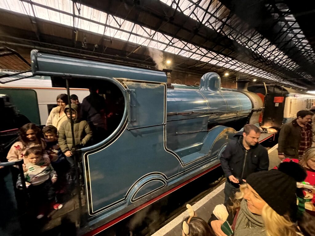 For me the highlight of the trip came shortly after lunch, when a distant plume of smoke heralded the arrival of a “Santa Special” steam train. It was shuttling between Connolly and Maynooth today (I saw it again at Connolly at the end of the walk) and was hauled by Slieve Gullion, a beautiful blue Class S 4-4-0 steam loco built in 1913. The eight carriages appeared to be full of excited children (of all ages) enjoying the thrill of the ride and sustained presumably by plenty of mince pies.