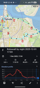 Close-up location (The blue line shows where I walked) (Click button below to download GPX of today’s walk as recorded, or see interactive map at bottom with elevations corrected): Robswall on wet night |