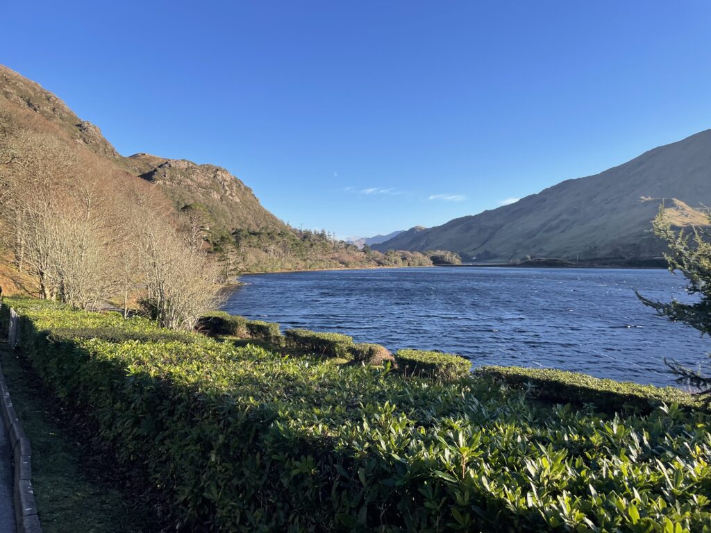 The house became an Abbey in 1920, after it had been acquired by a group of Benedictine nuns who had fled from their monastery in Ypres, Belgium, in 1915. It’s been open to the public for at least 20 years and as well as the house (which is well preserved and well presented) there’s a church on the Lough side and a couple of km up the valley is a huge walled garden.