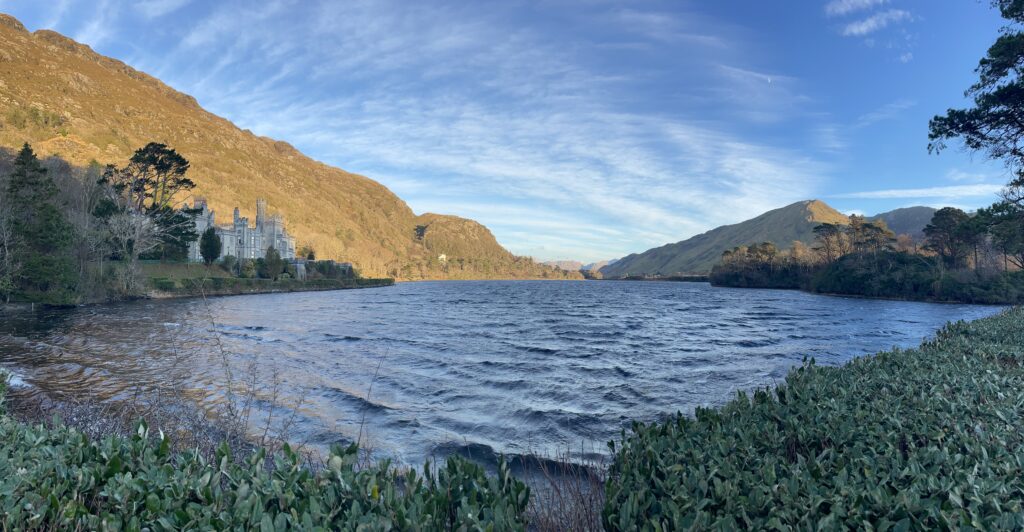 Panoramic view over the lough with the iconic abbey on the left.   Its image (shown in the banner image at the top) is also reproduced on page 12 of the current Irish passport