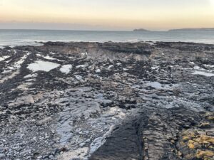 Low tide on Lithostrotion beach – with Ireland’s Eye in the background on the horizon Our fifth season of Alexanders is just beginning to show its face to the winter sun