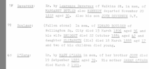 Last time when we visited Kilkenny in April 2022, we were fortunate enough to find the relevant churchyard – at St Rioch’s off Walkin Street. We were also lucky to meet Tom Reade, who tends to the graves and was on-site when we dropped by. We were particularly fortunate because the grave we sought was fallen, broken, and had a piece missing so it would have been very hard to locate. But Tom knew where it was and was able to guide us. And in a further stroke of luck, we found on the web a 1982 survey by Kilkenny Archaeological Society which had recorded the full inscription on the grave before the critical piece went missing So we were able to confirm that the remaining pieces were indeed from the Boulgers’ headstone.
